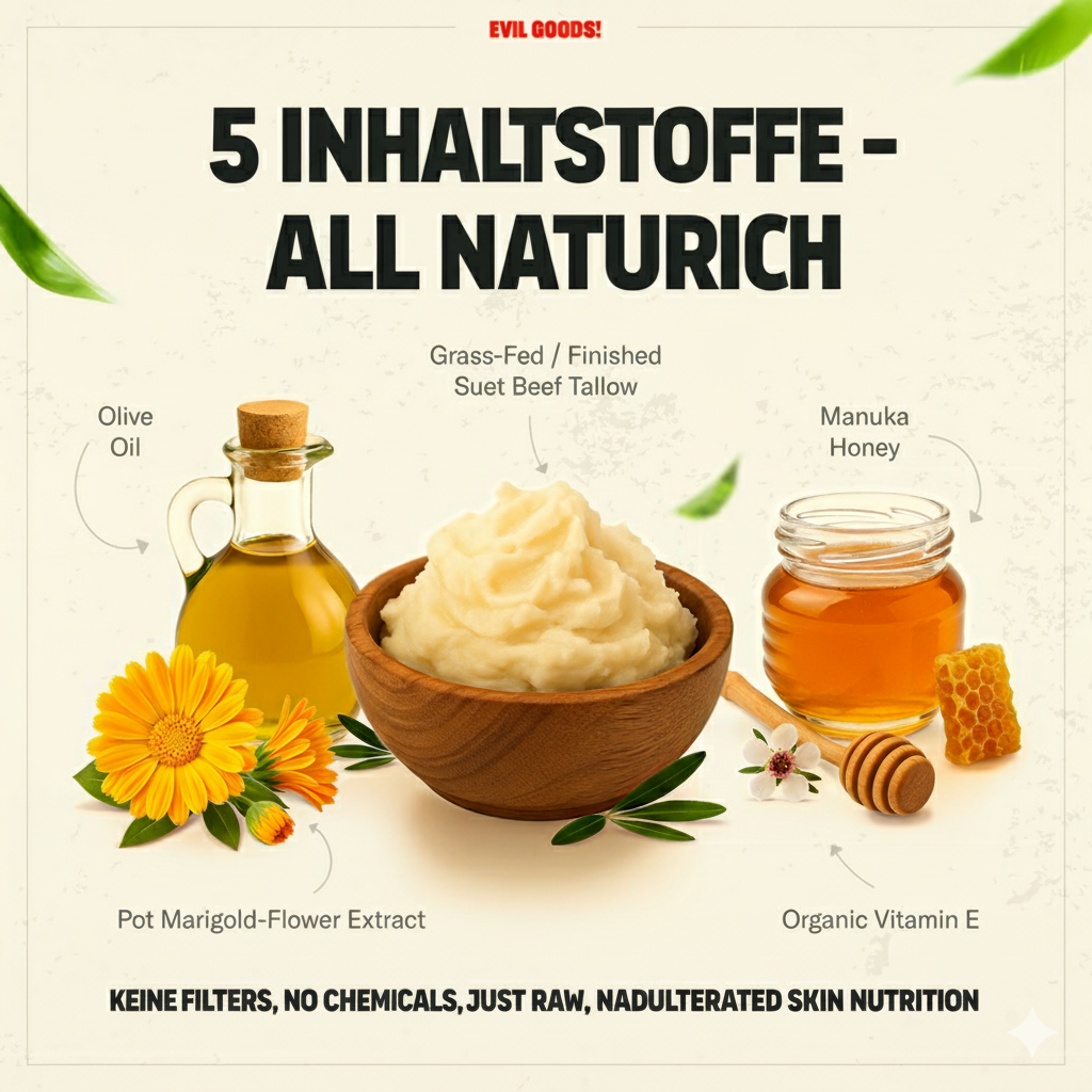 "Die meisten synthetischen Akne-Produkte zerstören die Hautbarriere, was zu chronischen Entzündungen führt. Deshalb empfehle ich meinen Klienten bei Akne gezielt eine Umstellung: Grasgefütterter Rindertalg und Manuka-Honig beruhigen die Haut nachweislich und geben ihr genau das zurück, was sie für die Heilung benötigt. Das ist pure Medizin für die entzündete Haut."